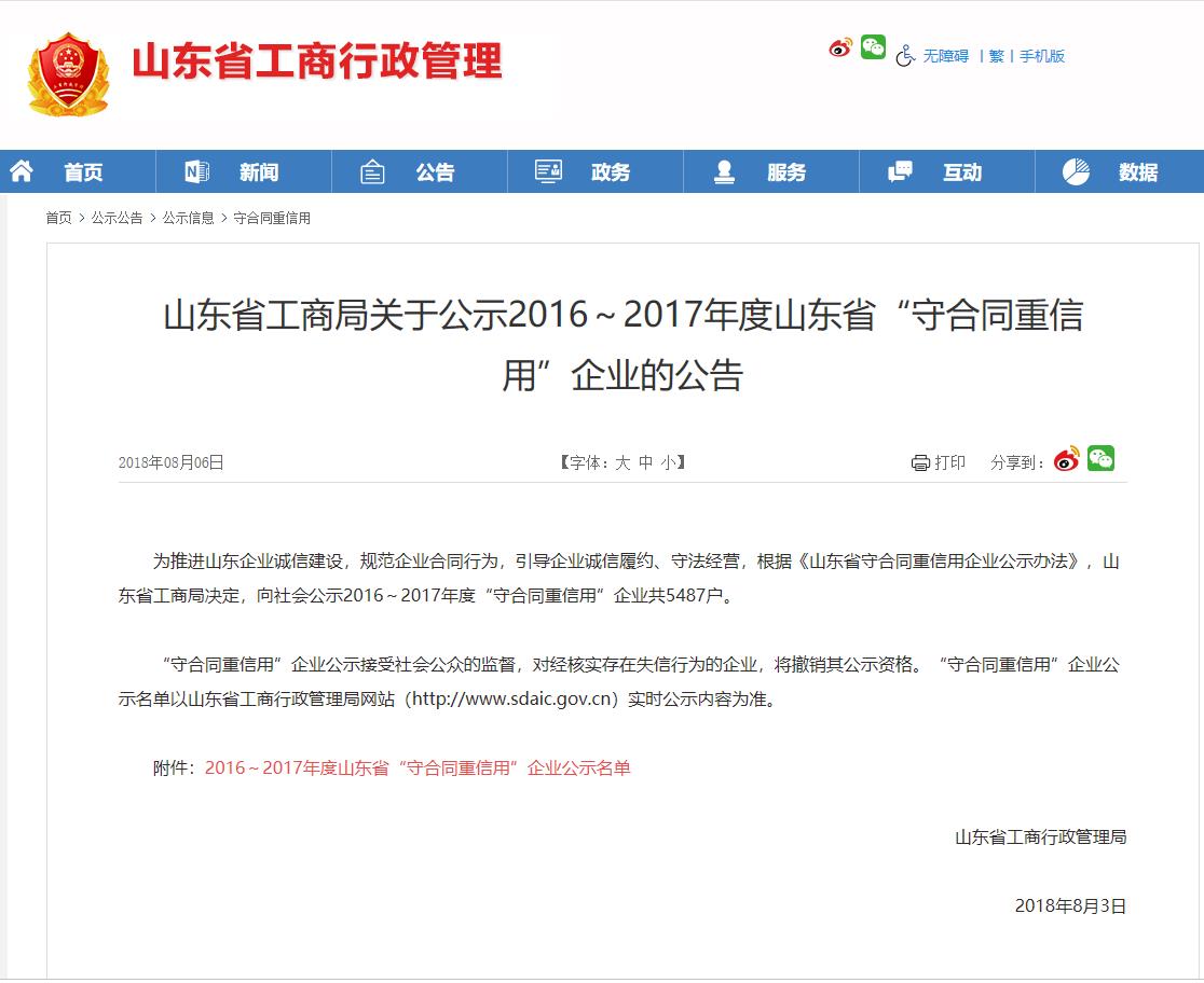 为推进山东企业诚信建设,规范企业合同行为,引导企业诚信履约、守法经营,根据《山东省守合同重信用企业公示办法》,山东省工商局决定,向社会公示2016~2017年度“守合同重信用”企业共5487户。二公司在名单之列。