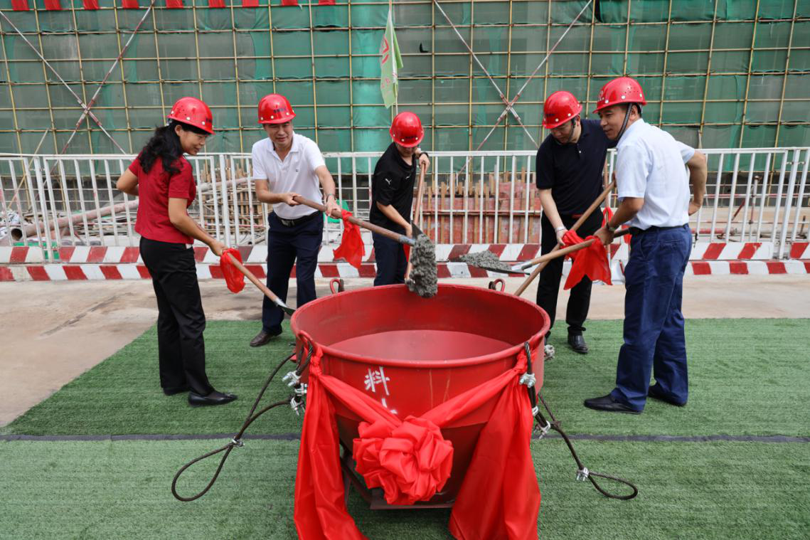 最后,几位领导共同挥锨为封顶铲起第一斗砼,封顶仪式在鞭炮齐鸣中顺利进行!