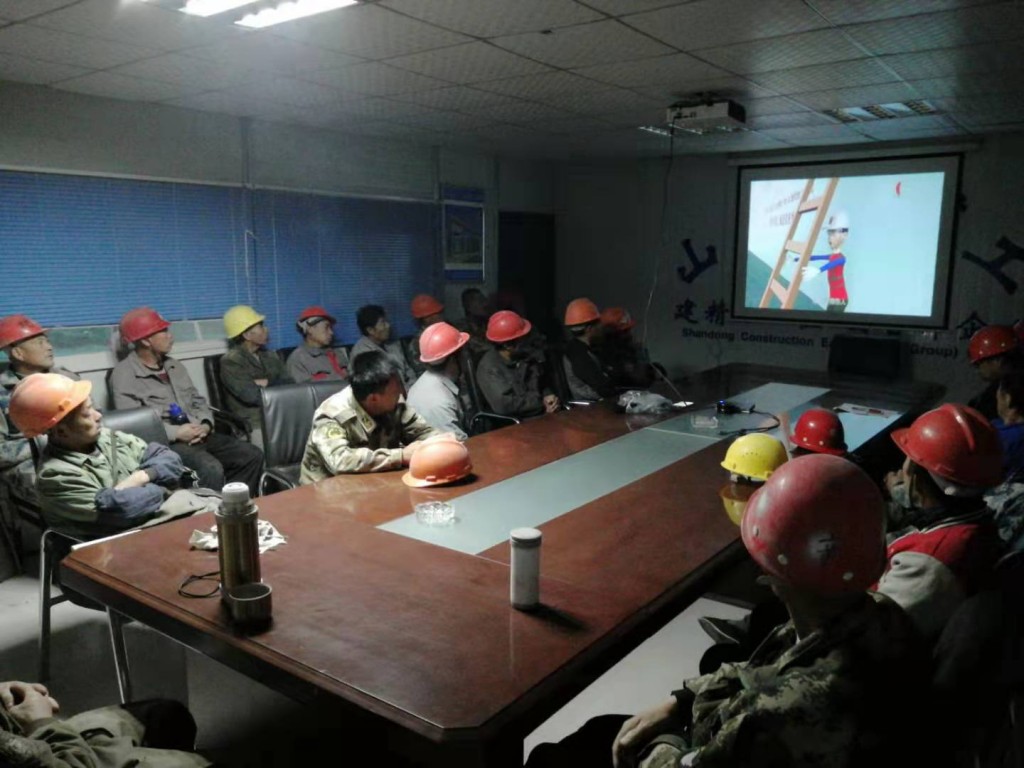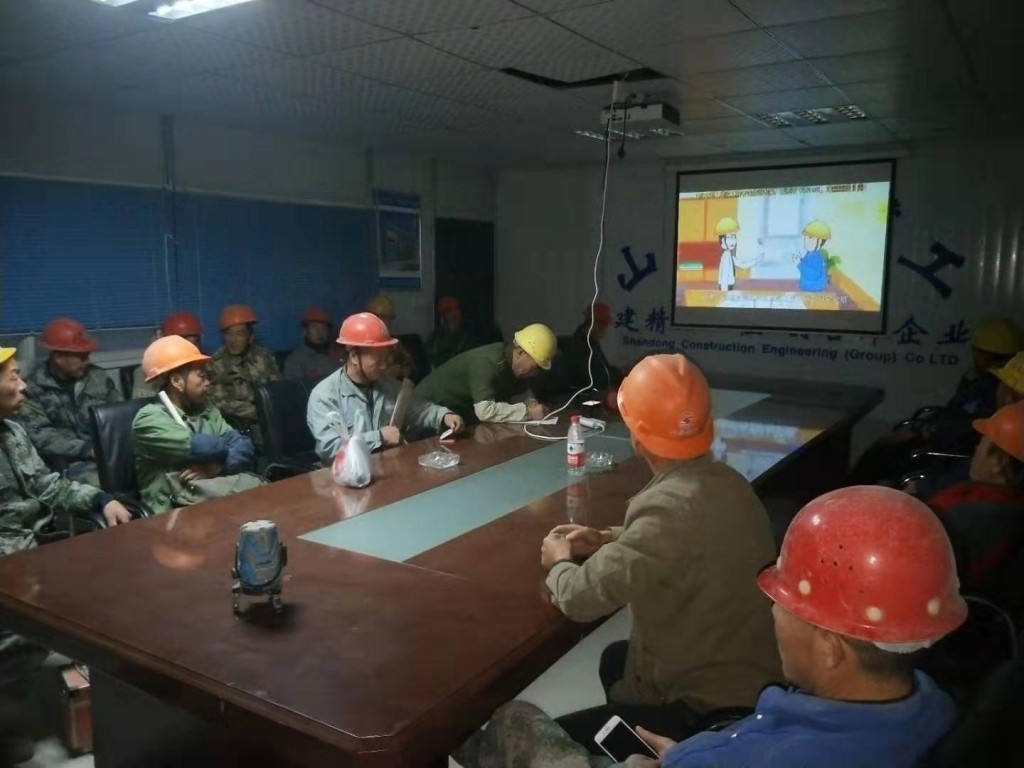 在会议室为工人播放施工现场安全教育视频,工人们看的非常认真。