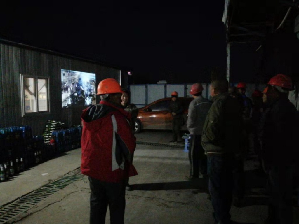 在生活区为工人播放生活区消防安全教育视频,工人们认真观看。