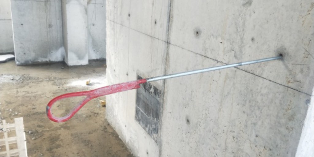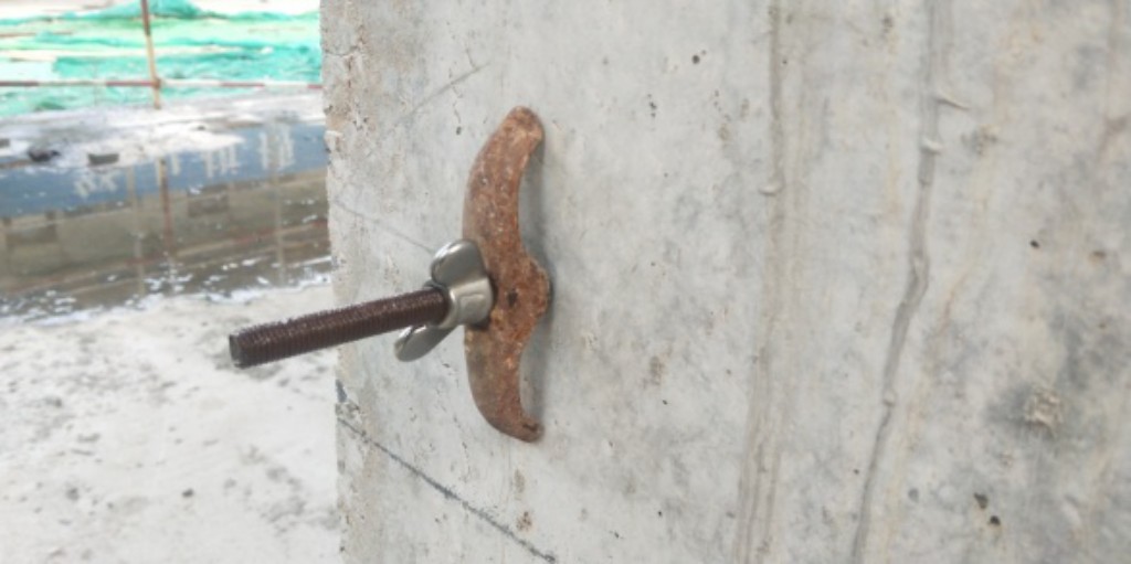 同时在高处作业安全防护上也进行了创新,临边作业:架体模板拆除完毕后临边作业存在很大的安全隐患,临边作业人员安全带系挂问题,没有可靠地系挂点,存在高空坠落隐患源。对此我们经过多次设想、实验,最终制作出了可靠地安全带系挂挂环。通过剪力墙的穿墙螺杆洞,将挂环穿过螺杆洞拧紧元宝螺栓,将安全带挂在另一端的挂环上安全可靠。