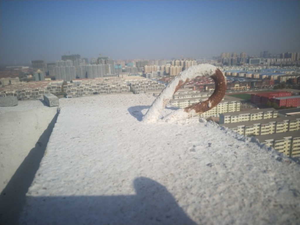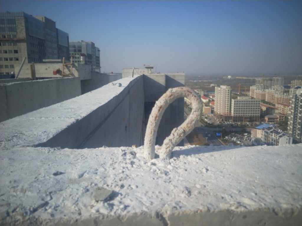 另外在施工吊篮的安全绳的固定问题上我们也做了改革创新。在女儿墙上预埋18#圆钢预埋挂环,将安全保命绳牢固的系在预埋安全挂环上安全可靠。
