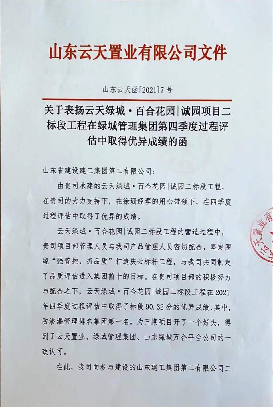 近日,公司云天绿城·百合花园诚园项目收到建设单位的表扬函。由公司承建的诚园项目在项目经理徐珊的带领下,在四季度过程评估中取得了90.32分的优异的成绩,其中防渗漏管理排名集团第一名。