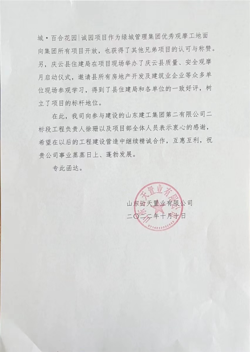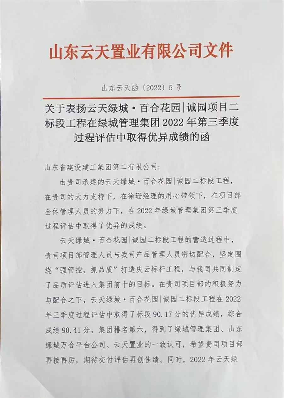 近日,公司云天绿城·百合花园诚园二标段工程再次收到建设单位的表扬函。该项目在在2022年绿城管理集团第三季度过程评估中取得了90.71的优异成绩。