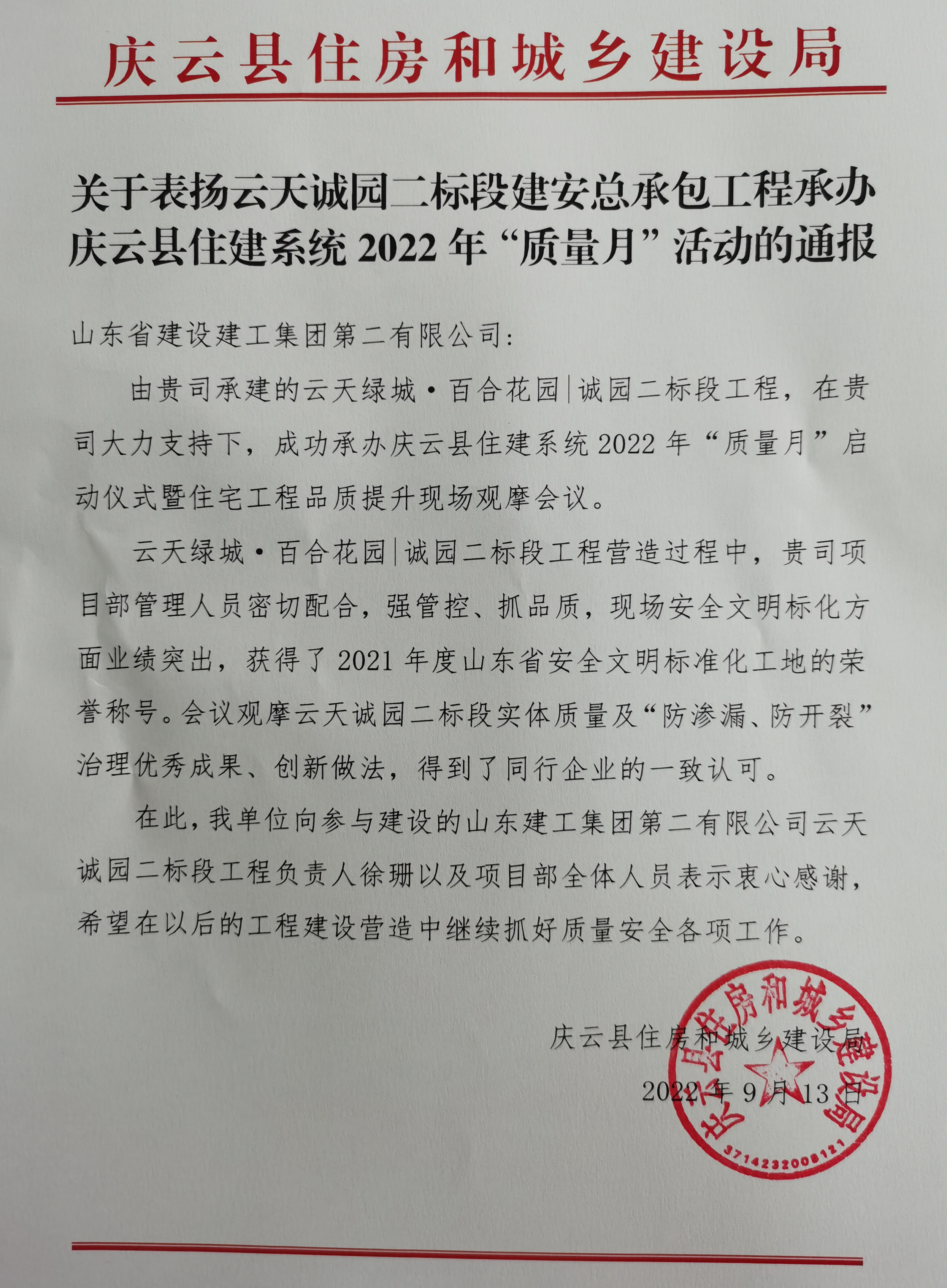 2022年9月13日,山东省建设建工集团第二有限公司荣幸收到庆云县住房和城乡建设局对云天绿城·百合花园诚园二标段的表扬信。