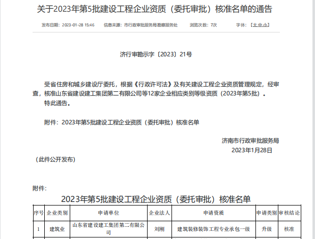2023年1月28日,济南市行政设审批服务局网站发布了关于核准2023年度第5批建设工程企业资质名单的通告。山东省建设建工集团第二有限公司顺利升级建筑装饰装修工程专业承包壹级资质。