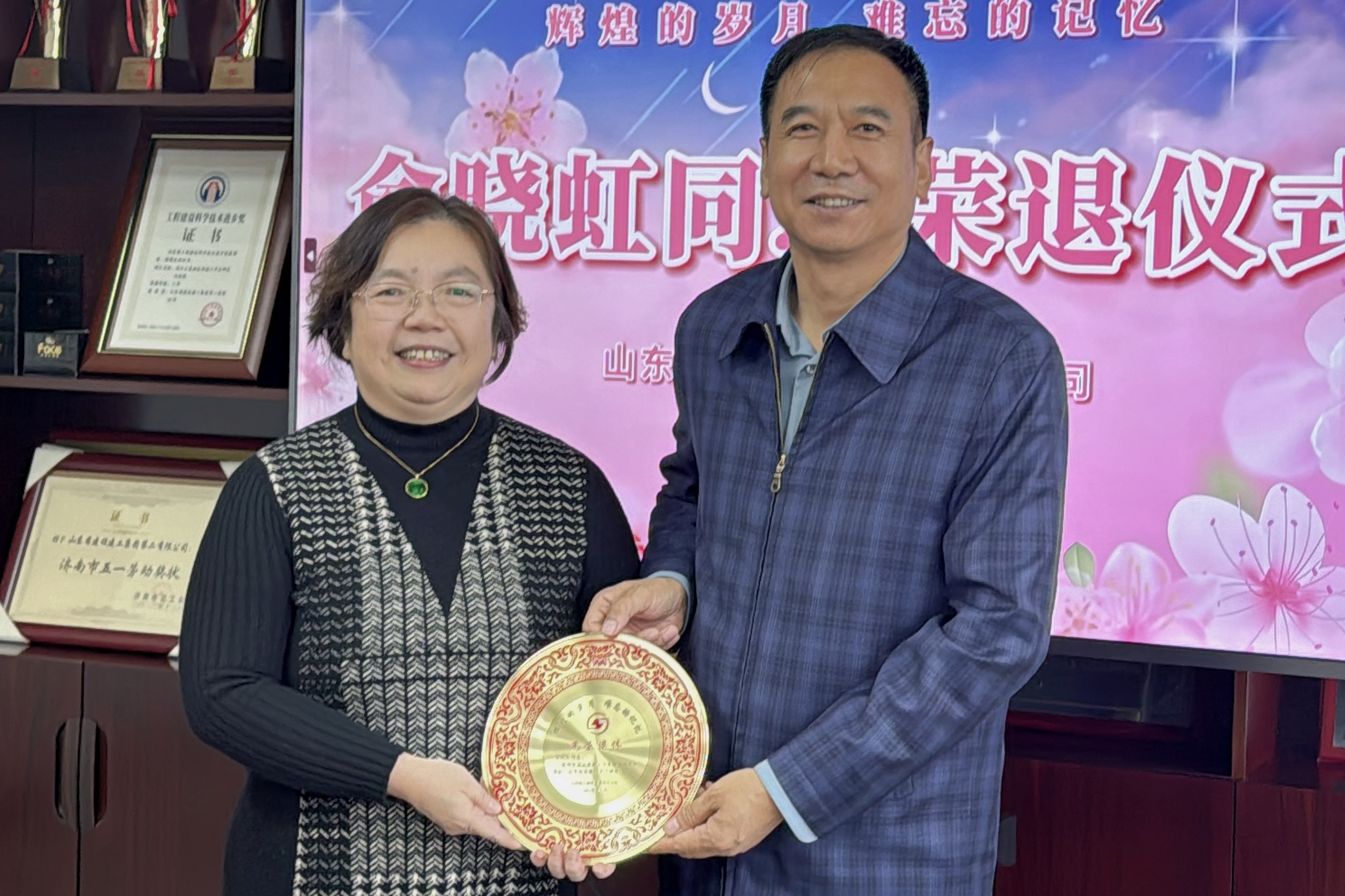 仪式上,公司董事长刘刚为俞晓虹颁发了定制的纪念铜盘和荣休纪念册,送上了鲜花、集团荣休纪念品,对其多年来辛勤付出表达了感谢。
