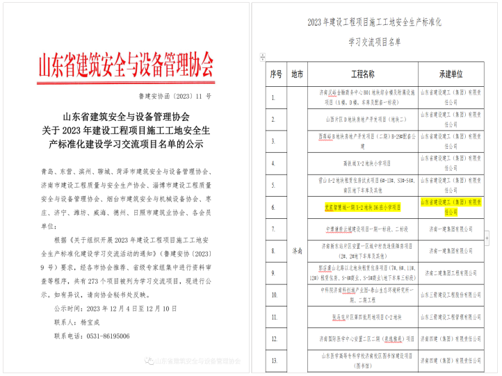 项目部为此组建了安全管理经验丰富的管理团队,健全安全生产管理领导小组落实领导生产安全责任制。编制针对性和可操作行强的施工组织设计和各类施工方案,对施工人员进行三级安全教育和安全技术交底。此次成功入选“山东省建设工程项目施工工地安全生产标准化建设学习交流项目名单”,是项目安全管理生产工作的极大肯定。
